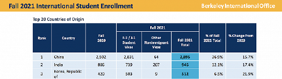 2021秋季学期国际生数量排名前三的来源国。 图片来源:加州大学伯克利分校国际学生办公室官网